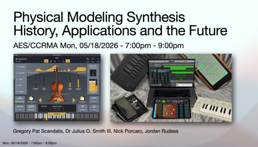 Join AES San Francisco for a presentation on Physical Modeling Synthesis History, Applications and the Future, with Gregory Pat Scandalis, Dr. Julius O Smith III, Nick Porcaro and Jordan Rudess at Stanford University’s Center for Computer Research in Music and Acoustics (CCRMA).